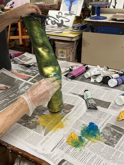 I lay down acrylic on the newspaper, and begin using a paper towel for the applier. I can add different colors and mix them on the newspaper, then apply to the form.